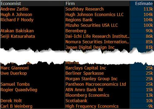 根据媒体调查汇总,目前华尔街分析师对今晚非农的预测范围在-0.9万至+11.3万之间。