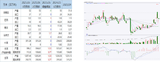 元股证券春节之后,基层惜售情绪仍较强,中下游企业以谨慎备货为主,上周地缘政治冲突带动大宗商品上涨,并带动农产品看涨情绪较强,玉米现货价格跟随偏强震荡。截至3月10日,北港二等玉米平仓价为2420元/吨,较上周同期上涨20元/吨。本周主力合约2605合约跟随大宗商品趋势冲高回落后,再度偏强震荡。